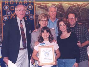 And a child shall lead them President Bill introduced Millie Farber, who led as in the Pledge of Allegiance. She would have done a good job of leading the singing, but some "stand ins" for Maestro Duncan and the Grifftones handled that role. J Ritchey provided a fine thought for the day on the subject of Living Life on the Positive side. The analogies of the crayons and the retirement plan for those who work God were especially useful thoughts. Lots of Guests Randy McFarland introduced our visitors of which there were several, but your Rotagram scribe lost the slips that included the names. Please fine him substantially. Introducing their guests were Bob Sattler, Tom Meyer (in absentia), Jim Blake, Frankie Berry and Kathy Allred Blake. Announcements Pat McKinley announced the upcoming demotions of Bill Mathy, which was warmly (even ecstatically received. June 30 at the Four Points Sheraton at the corner of Raymond and the 91 Fwy. Bob Clark Jr. announced a fund raised for the FOX at the Springfield on Friday evening. Top 100 another big success Prez Bill recognized those who helped with the event and gave special recognitions and Rotary Clocks to Bill and Shirley Kincaid. Ed Little's skill at slicing tomatoes was greatly touted, and became the first of several dozen persons to receive on of the high sought after and incredibly rare Rotary Clocks. Recognitions of Philanthrophy We received a thank you note from the Needlework Guild of Fullerton, which apparently used our $700 donation to help eradicate temporary nudity in Fullerton. Kathy Allred Blake introduced Chris Dearman of WTLC, and together they offered obviously sincere thanks for the $1000 provided to that splendid organization. Several Rotary Clocks were presented at this point. Dick Mathewson introduced Sue Faassen, principal of Beechwood School and noted that Millie Faber (a Beechwood student) had donated her birthday gifts ($340) to WTLC. A certificate and a Rotary Clock were presented to Millie in recognition of her acts of selflessness.