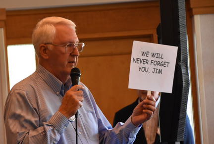 Bill Mathy announced that the city of Fullerton has accepted a gift from Fullerton Rotary Club for the 100th anniversary. 'It's a 15-foot-tall clock, 3 feet wide. We picked a spot in the Fullerton Plaza where it will be connected to lights and will be a beautiful addition to the city and a great tribute to our club for our 100th anniversary.' Bill Mathy said he is glad that this was accomplished during Joe Lins' year as president, 'I knew I would get a little choked up, and I wish Joe the best.' He presented Jim with a Wile E. Coyote sign, but first showed the club the announcement on the sign. 'WE WILL NEVER FORGET YOU, JIM.' What a great joke Bill!